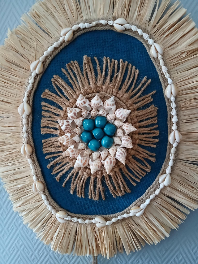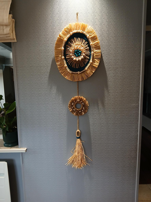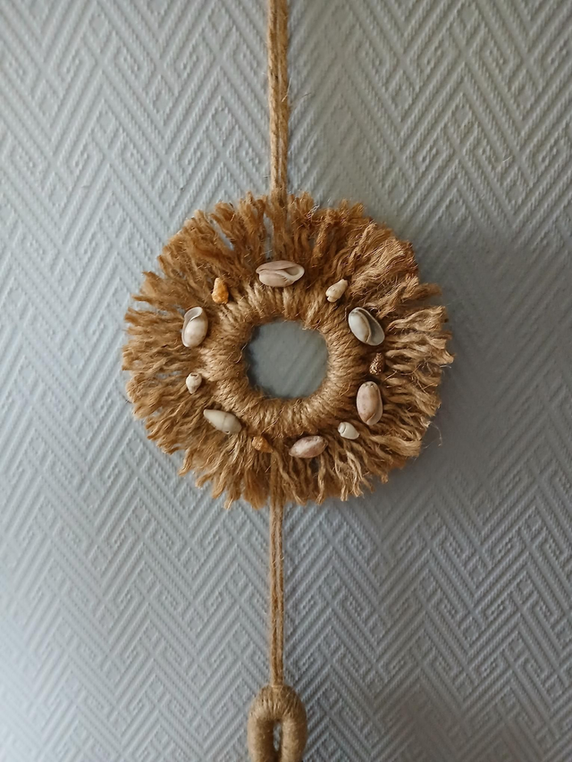 Suspension murale Boho, composée de jute, raphia, perle coquillages