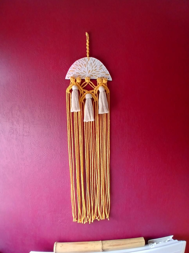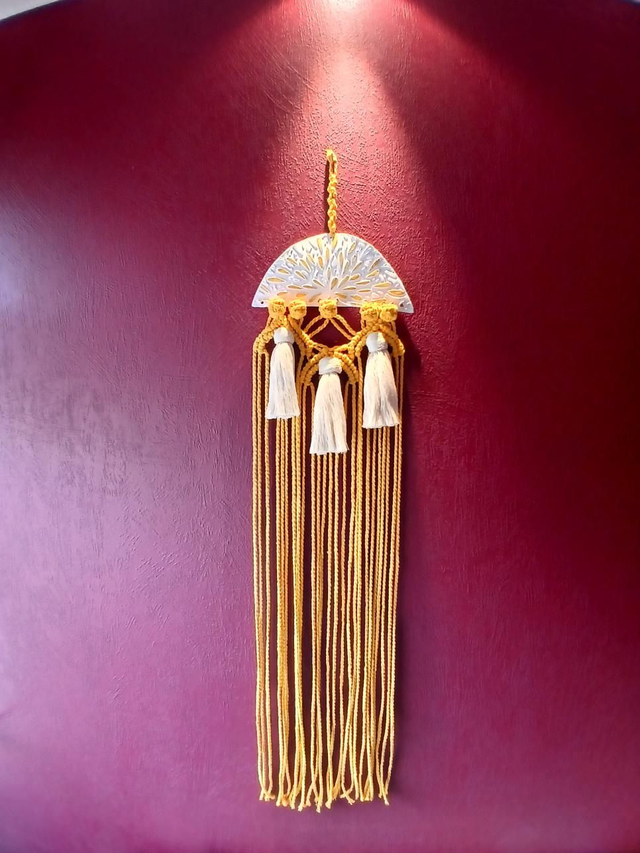Décoration murale en ciment auto-durcissant blanc et doré, agrémenté de coton ocre tissé selon la méthode macramé