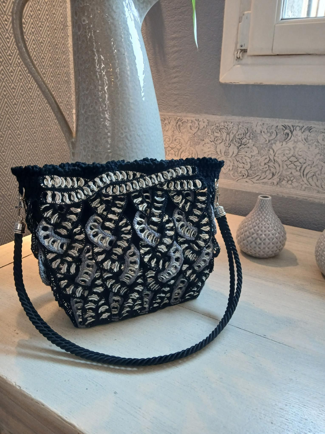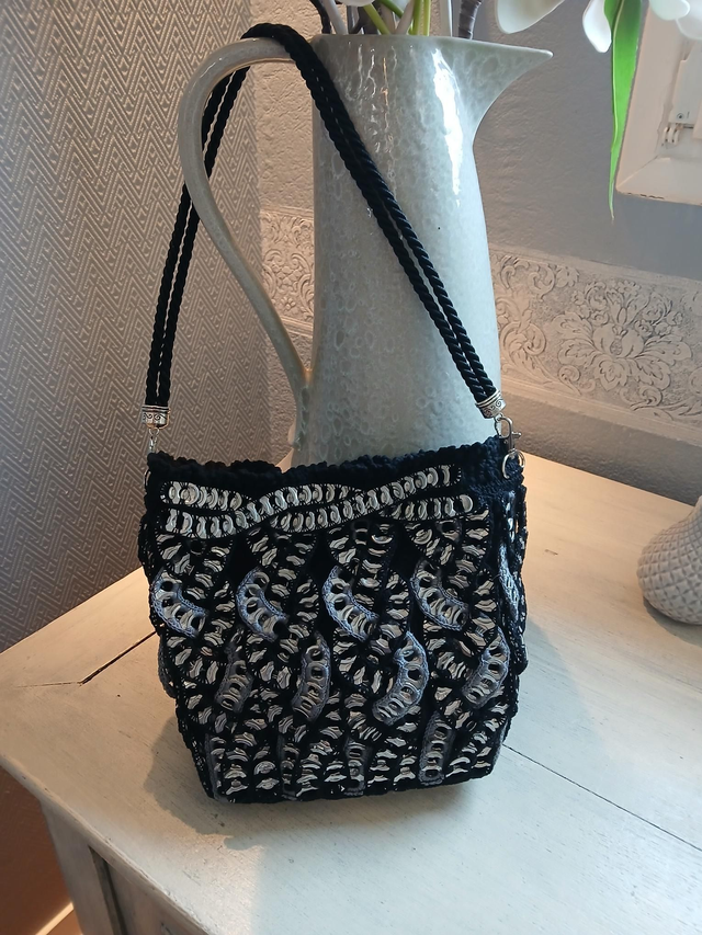 Sac à main doublé et réalisé à partir de capsules de boîte style " coca" lavées et désinfectées.