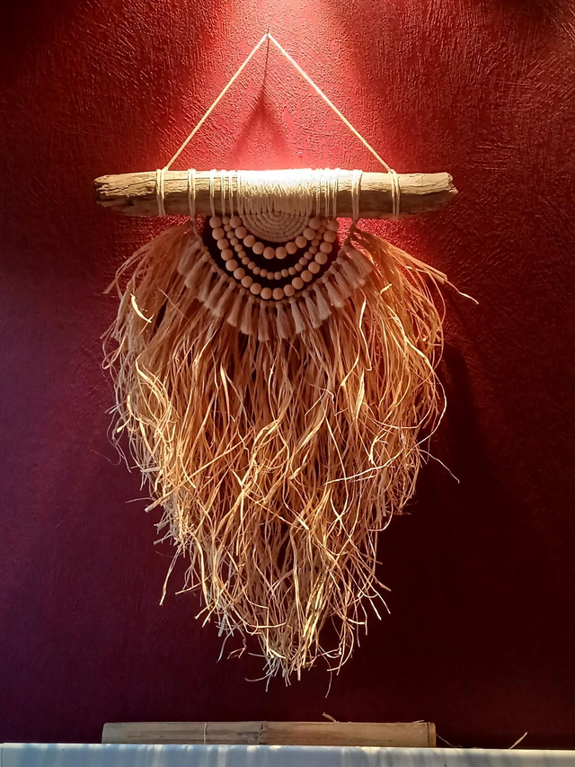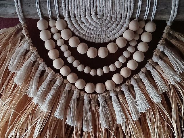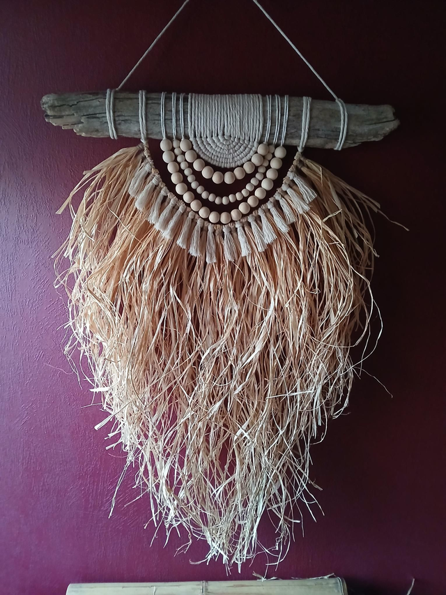 Suspension murale bohème en raphia et perles de bois