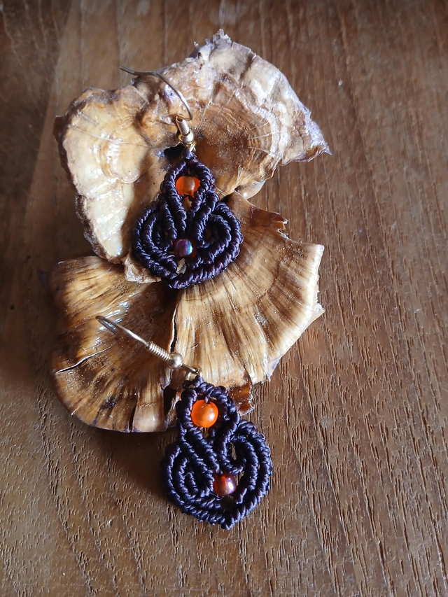 Boucles d'oreilles fantaisies réalisées selon la méthode macramé en coton ciré brun, agrémentées de perles synthétiques orangées